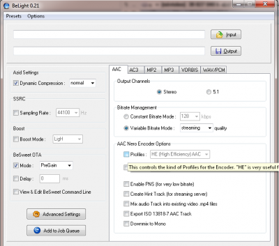 "AAC is SBR/HE-AAC/AAC+: The new technology called 'high efficiency AAC' has some drawbacks when it is being stored in .AAC files: it is not possible to detect the HE-AAC part for these files. Therefore the user has to check this option manually if it applies. Please note that this problem does not exist for HE-AAC stored in .MP4 files."