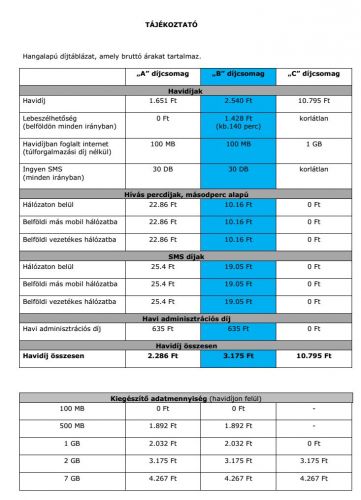 A dpi tájékoztató 3 oldalas. Az első oldalon vannak a hangcsomagok összetéve a minimálisan kötelező mobilnet opcióval. A második oldalon szerepelnek az opciós és külön kártyás mobilnet előfizetési lehetőségek.