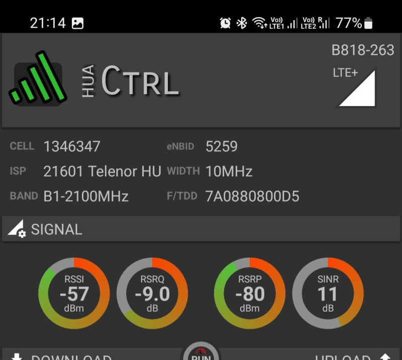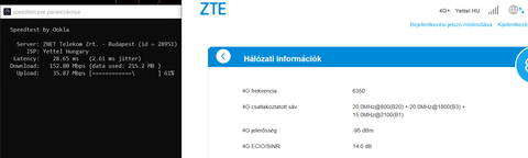 Pl az előbb elég gyenge volt a sebesség, jel, ping... B1 - B3-ra volt csatlakozva. Elegem lett, újraindítottam menüből (nem nyúltam az eszközhöz) mégis elsőre a B20 -ra csatlakozott. Itt annak a jelerőssége a legjobb (5 vonal), 100 alatti 80-90 dBm, de a letöltési sebesség gyenge max 30 Mbit/s. Aztán indítottam valamit és B20 mellé csatlakozott még egy sávra talán 1-re. Most nem látom, mert pár napja újra előjött a korlátozás, vagy mi, hogy csak 4G és 1 sáv. Nehezen csatlakozik 4G+-ra és 2 sávra. Korábban mindig 3-ra és fw frissítés óta nem dobta le sima 4G-re.