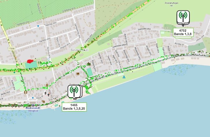 4.2 km-re van a legközelebbi torony, kb. 250 fokra. Ez eléggé távol van. Az adott tornyon 2100, 1800 és 700 MHz-en dolgozó cella van, ezek közül céleszköz nélkül szinte csak a 700 MHz vételére van esélyed.