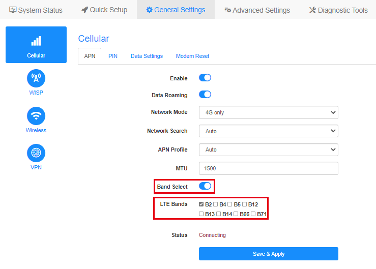 Cellmapper alapján a legközelebbi torony az B28 sávon sugároz a tanyára,ilyen sáv nincs is a beállításai között.