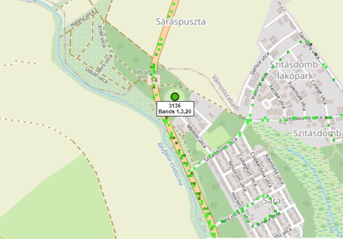 Az EARFCN a cella középfrekvenciáját adja meg. Az LTE szabványosított frekvenciasávokon működik - itt a teljes lista, - Magyarországon ezekből a B1,B3,B7,B8,B20 és B28 van használatban. Itt egy kalkulátor, ami megadja, hogy melyik sávon pontosan hol üzemel a cella. A 275 ez alapján a B1 sávban van. A környéken pedig egyetlenegy olyan eNodeB lett csak feltérképezve, amin van B1, de ha több is lett volna, a PCI-k összevetésével úgy is össze lehetett volna párosítani, a 337-es PCI a Hetényegyházi torony délkelet felé néző B1 szektoránra lett kiosztva. (Egy TAC régiókódú övezetben egyszer szerepelhet csak egy PCI azonosító.)