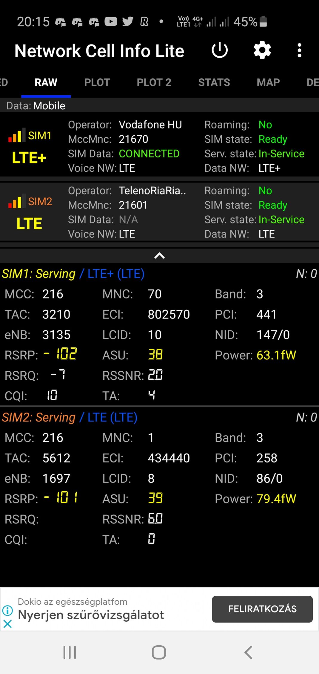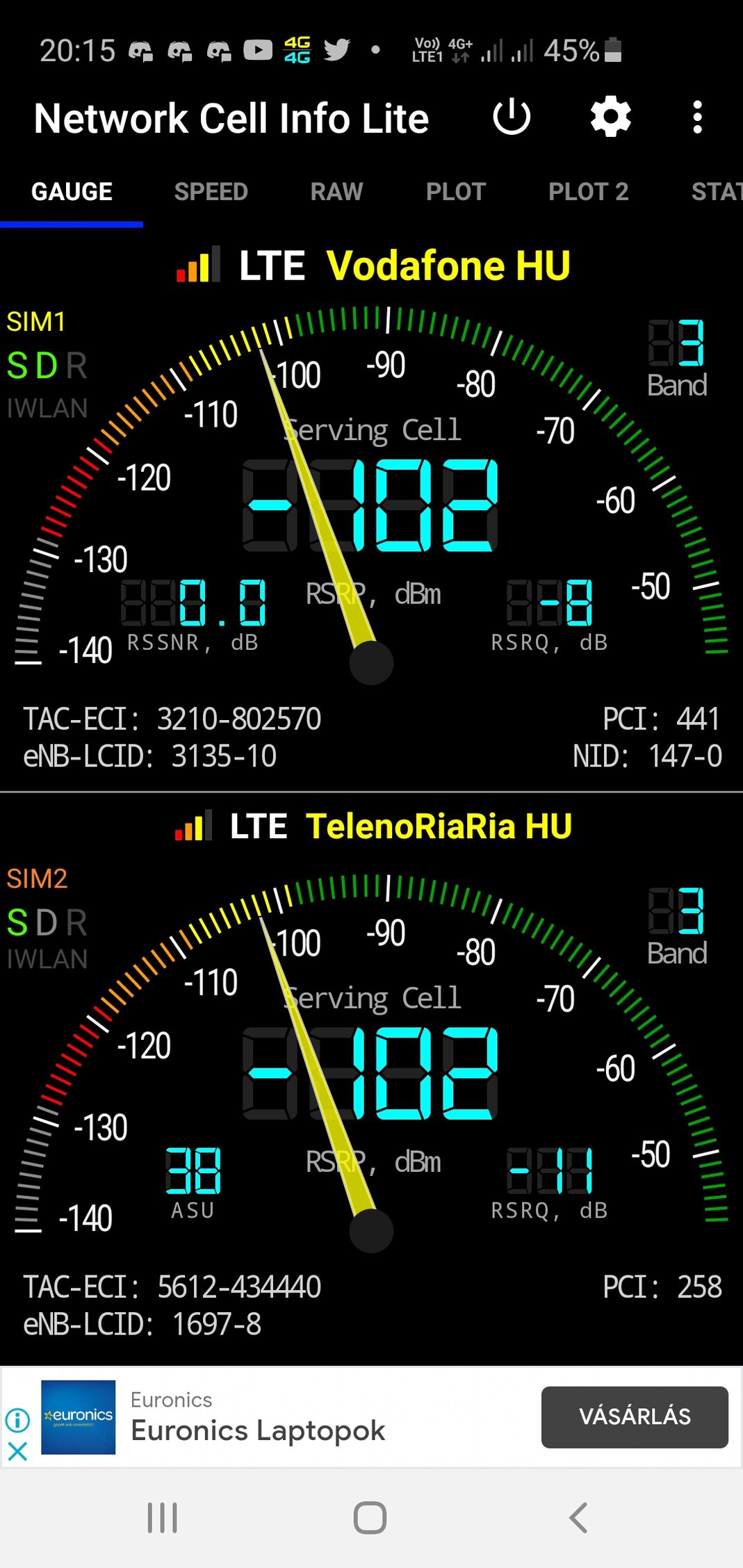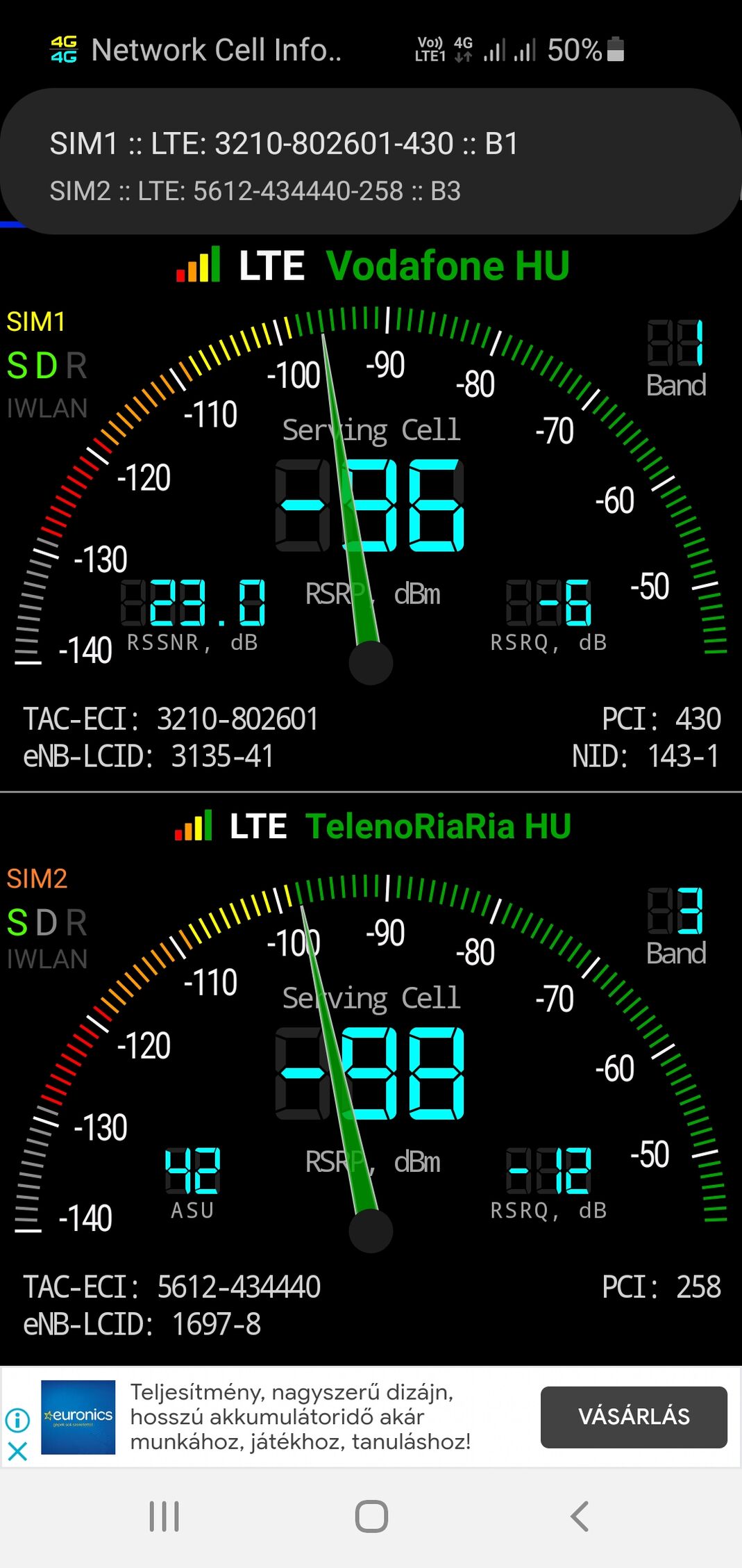 A TAC a régiókódokat jelzi, Telenor és Telekom hálózatokban a 30-39 ezer közti TAC kódok a Dunától keletre eső, Telekom által üzemeltetett Band20-as helyszíneken használják. (A Dunántúlon pont fordítva, a Telenor üzemelteti a B20-as tornyokat, azoknak 20-29 ezer közötti a TAC kódjuk). Ezekről a megosztott tornyokról annyit érdemes tudni, hogy mára a többségük telített, ilyenkor pedig az ütemező elsősorban a toronyhoz közelebb lévő, jobb jel-zaj aránnyal kapcsolódó eszközök forgalmát priorizálja. -110 dBm alatt már nagyon gyenge a jel, ha eközben a cella is telített, akkor kb. élvezhetetlen lesz a szolgáltatás.