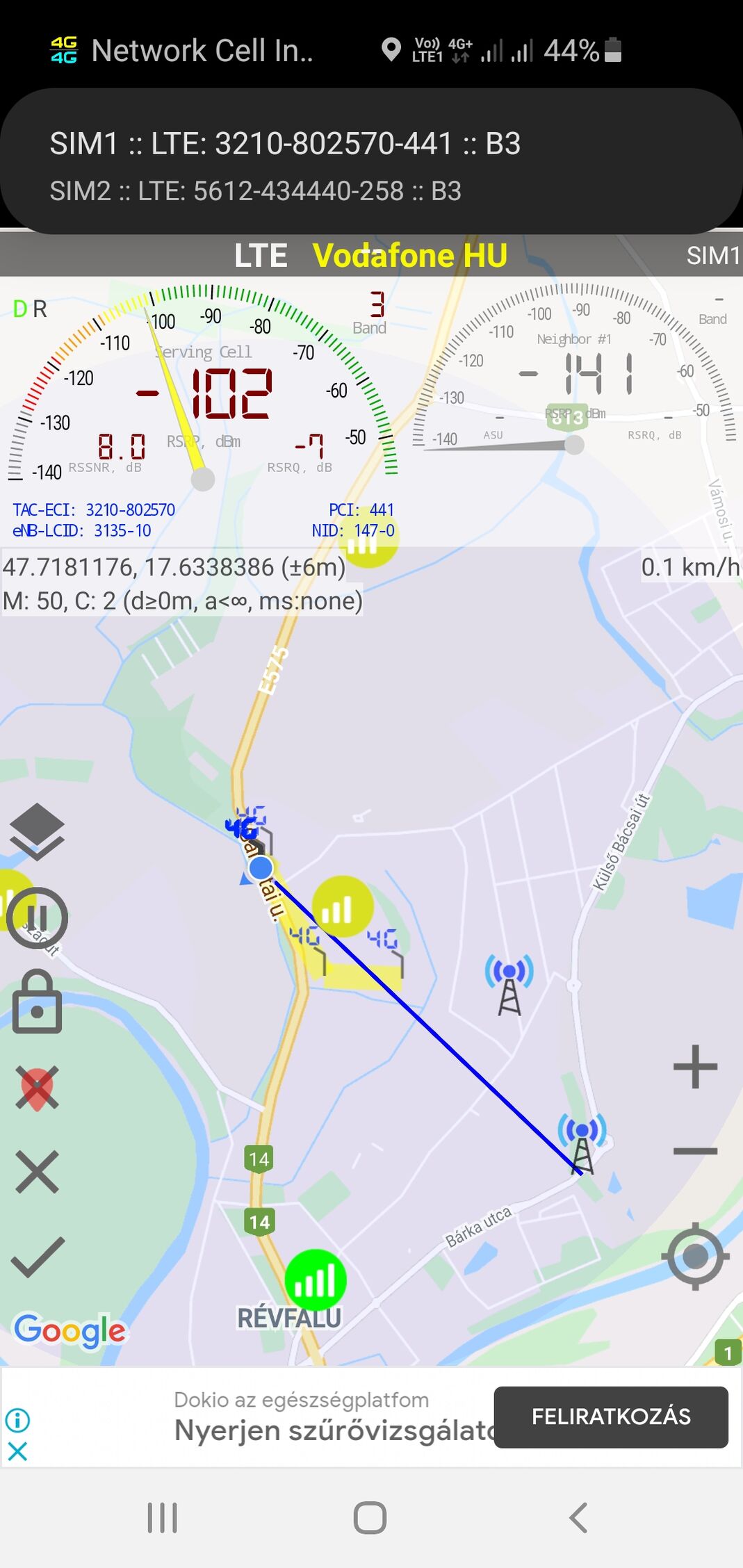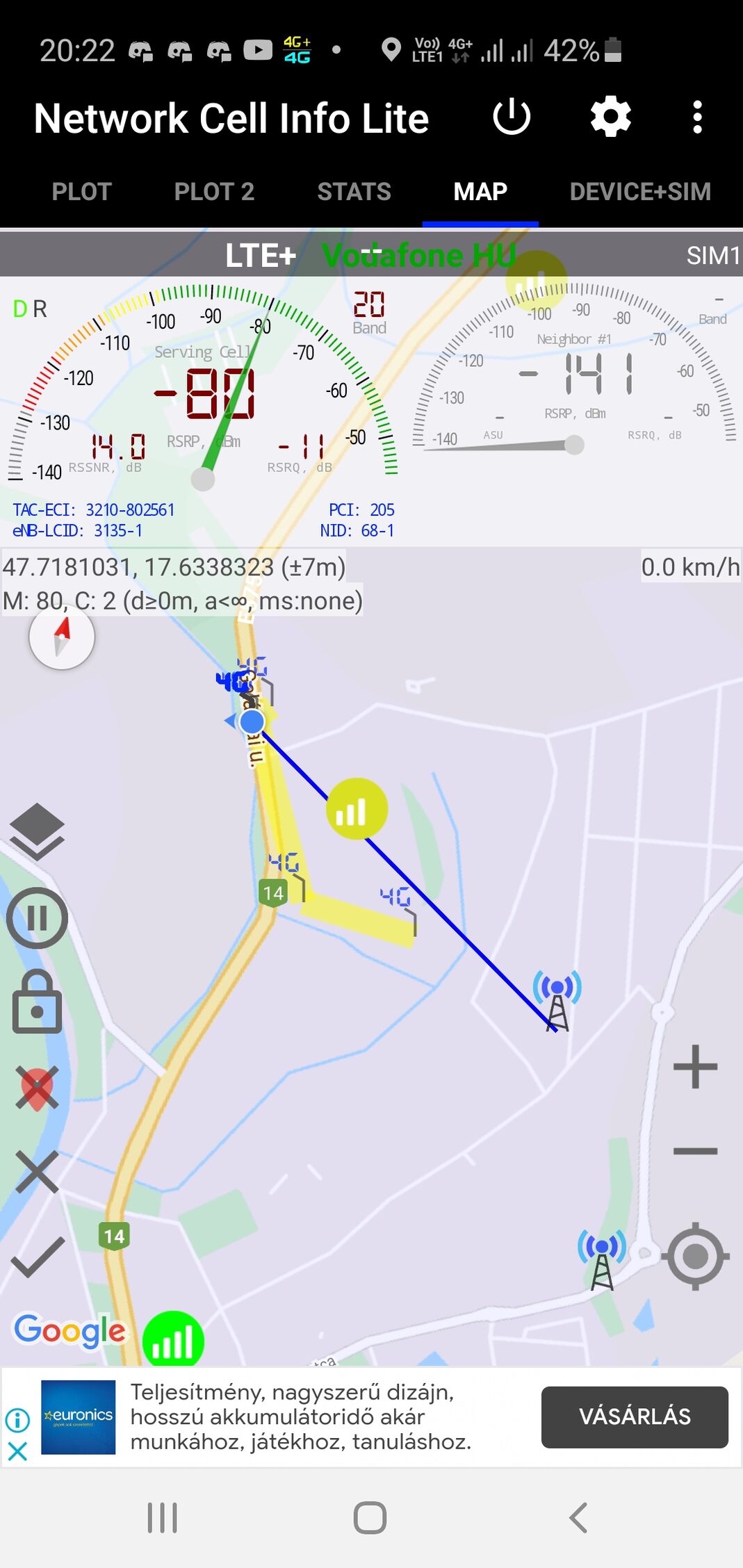 Első körben telepítettem a Cellmapper alkalmazást a telefonra. Még eddig nem használtam. Asztali gépen néztem meg a weboldalt és a térképről olvastam le az adatokat. Iránymeghatározásra is jó volt a térkép.