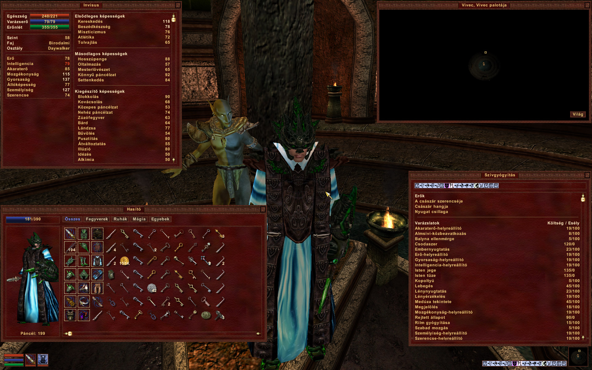 Jó kis restore (+ fortify esetleg) fatigue-es pósönök, olyan nincs, hogy kimerüljek és arra várjak, hogy feltöltődjek, hogy esetleg el is találjak valamit, ha támadok. A SPE pillanatok alatt nő a szintlépésekkor, endurance-szal együtt, hogy az athletics alacsony az elején, ám legyen, számít a speed attribútum is. Mivel állandóan futok, gyorsan nő egyébként is, és legalább nem zavar be a szintlépésekbe. Külön öröm már az elejétől levitálni, víz alatt lélegezni, vagy éppen járni a vízen, ha látok a távolban még egy kis szigetet... detect enchantment, detect key, sorohatnám, de a legszebb része akkor is a healing pósön, a gyári cuccok nagyon gyengék. Na meg legeslegelső kotyvasztás alkalmával csak a "salakból" bejön úgy 3-4000 arany, ami megint elég jól jön.