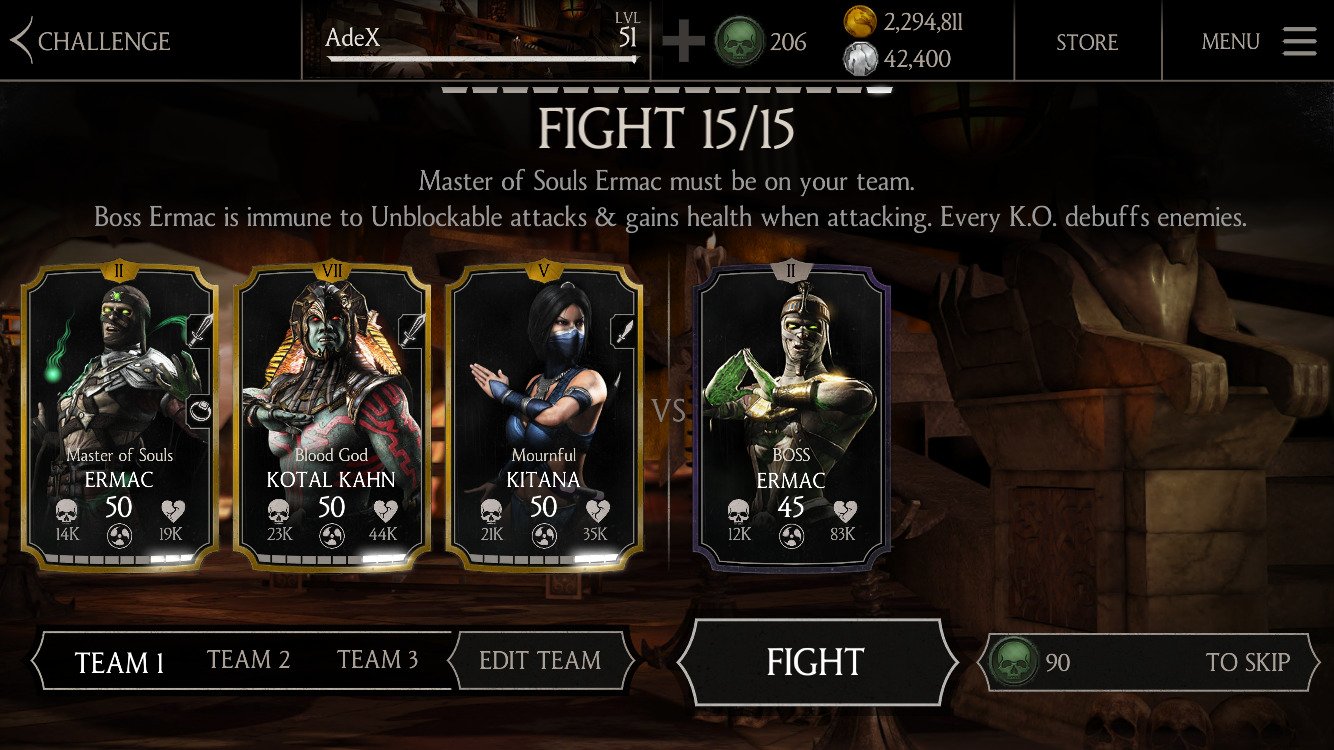 Amúgy ez az Ermac nem túl egyszerű szerintem, bár nekem mákom volt, mert pont a szükséges Ermac, amit eléggé tápoltam és egy kalapáccsal, meg egy Outworld taggal (ez nekem 50-es Classic Kano) X-ray-el kezdek, majd védelmet ad minden ellen kb. 15-20mp. (nem számoltam sose)