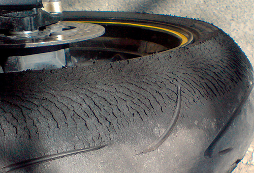 Ilyen ocsmany gumikepem amugy nem nagyon volt maskor. Hatso gumibol hoztam ki mar 120 kort is a hungaroringen, a dunlop elso gumik meg elmennek 2-300 koron at is ha jo a futomu. De a hideg aszfalt mindenkepp komoly stressz nehany guminak. Egyes keverekek egyszeruen nem birjak ki a huvos aszfaltot: itt van egy pelda [link] ez egy medium d211 hatso, es Dave Moss is arra a kovetkeztetesre jut hogy van egy kis rugo gond, de allithatsz barmit ez a gumi nem birja ki ilyen huvosben ezt a palyat