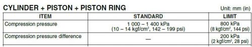 Más théma: mértem, ráadásul egész tűrhető értékeket. Langyi motorral a bal hengerben 12,1 bar, a jobb oldaliban meg 12,2 a sűrítési végnyomás. Gyári tűrésmező (megengedett elhasználódás) alább: