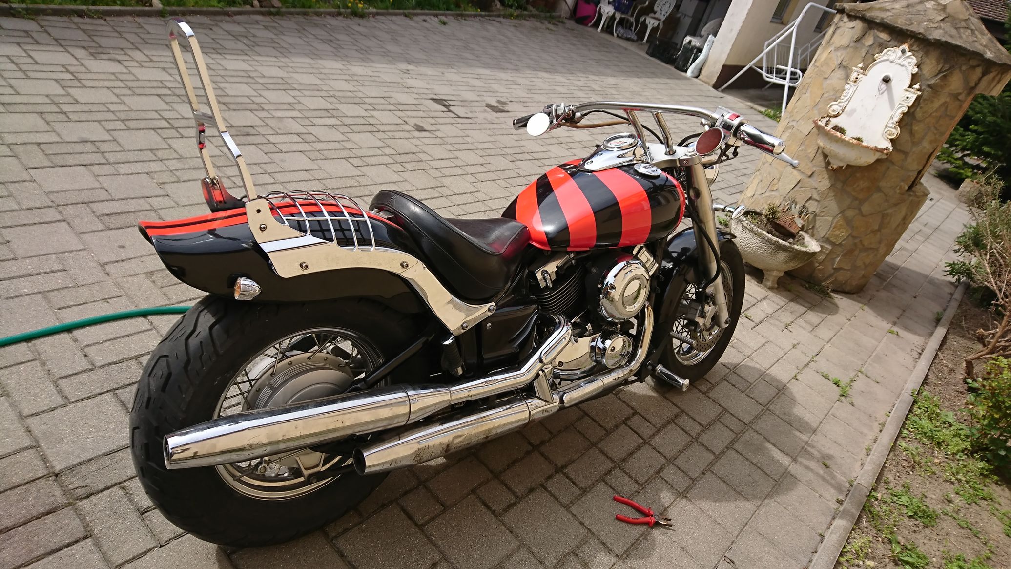 Ez ízlés kérdése. Gondoltam rá, hogy elviszem és metál fényt kap egy sötétebb, gyöngyház hatású pirossal. De nekem tetszik ez is. A kút nem az enyém, sőt itt igazából semmi sem az enyém a motoron kívül.