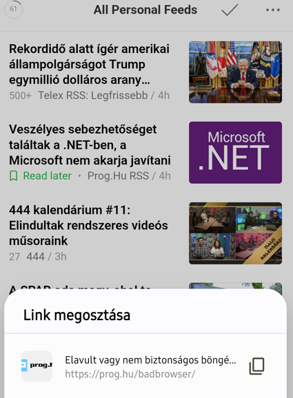 Nem a böngészővel van gond, hanem azzal, hogy a feedly (rss hírolvasó) nem tudja jól megnyitni a linket. Amikor a feedly-ből nyitok meg egy prog.hu linket, akkor rögtön prog.hu/badrowser a megosztott link.