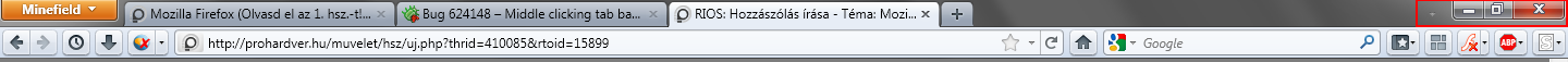 Ah.. mint mindig en voltam a hibas, mert nem eleg korultekintoen probaltam reprodukalni a problemat! Mindig belefutok abba hogy nalam ablakban fut a program es kiveszem a pipat a Felul elhelyezett fulel elol. A probanal felteszem a fuleket felulre, de elfelejtem Teljes mereture allitani a bongeszot es ezert nem jott elo a problema, most hogy irtad at allitottam teljesmeretre es valoban nem mukszik a kozepso gombos uj ful nyitas.
