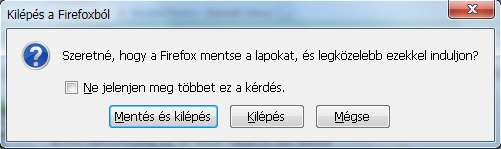 címsorba: about:config -> browser.showQuitWarning -> trueígy ha több lap van megnyitva és bezárod, felajánlja a megnyitott lapok mentését. ebben még nem volt hiba, egyik verziónál se.
