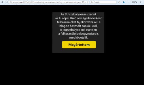 Ez az EU (is) tényleg teljesen meghülyült? Vagy itt inkább az oldal üzemeltetője ennyire gáz, hogy nem csinál egy kisebb, valami vékony sávban ilyen figyelmeztetést? A legtöbb oldalon egy sáv jön fel alul, vagy felül, mintha sablon szerint lenne, de szerintem az is túl vastag. Miért nem elég valahol egyszer elfogadni ezt a sok "süteményt" és kész? Elvégre minden oldal használja.