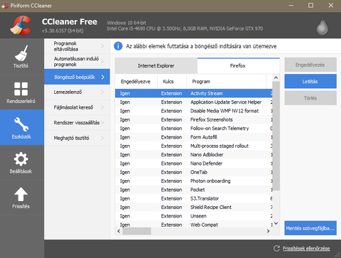 Mozillába a kiegészítőknél, azon belül a bővítményekbe van nekem egy olyan dolog, amit szeretnék letörölni, viszont nem találok rá ilyen opciót. Olyanok vannak, hogy rákérdezés aktiválásra, mindig aktiválja, vagy soha ne aktiválja. Vagy ennyire eldugták, abszolút már nem lehet törölni innen semmit? Köszi a segítséget! -