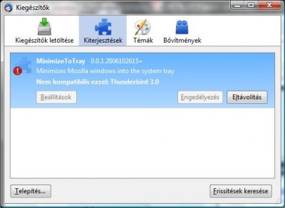 és az egész Kiegészítők részleg meggágyult: azt mondja a HungarianDictionary nem kompatibilis, de van frissítés-> telepít-> újraindít-> még mindig azt mondja nem jó, közben meg működik. Illetve gondoltam localhost kolléga tapasztalatából kiindulva leszedem, majd újrateszem a MTT-t, letiltás-> újraindít-> még mindig ott van, telepíteni nem enged mert nem kompatibilis...