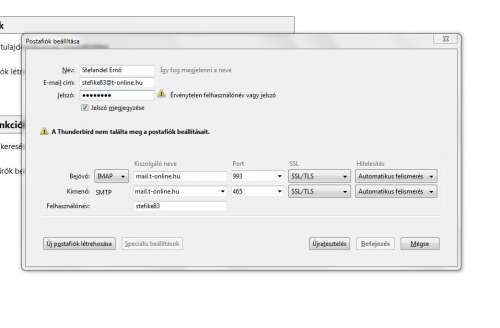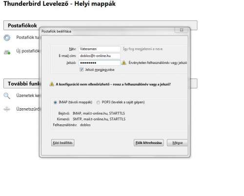 T-Online-s email címem nincs, ezért a pontos beállításokat nem ismerem, de a TB-nek van egy ellenőrzési metódusa, amikor is a beírt adatok alapján próbál csatlakozni a levelező szerverhez, neked már ezen megbukott, ezért írtam, amit írtam. POP3-as beállítást találtam a T-Home oldalán, de IMAP-ot nem, keresgélek és leírom mi a hiba nálad.
