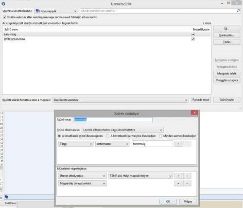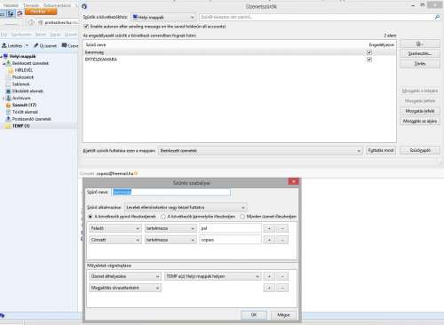 Ha már szűrők.. azok se működnek rendesen. A beérkezett levelek még csak-csak bekerülnek a helyükre, de az elküldött levelek nem, hiába van rá szűrő. A szűrő jól van beállítva mert ha a beállításoknál rányomok a Futtatás mostra akkor beteszi a helyükre a leveleket.