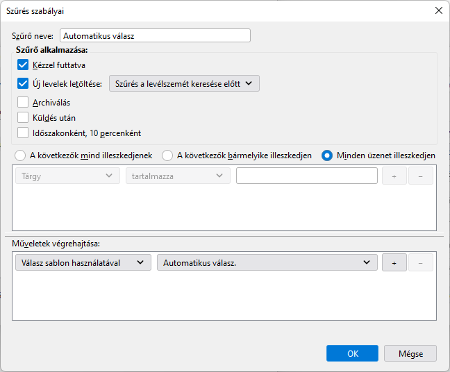 # Eszközök/Üzenetszűrők/Új (minden beállítás a képen)
