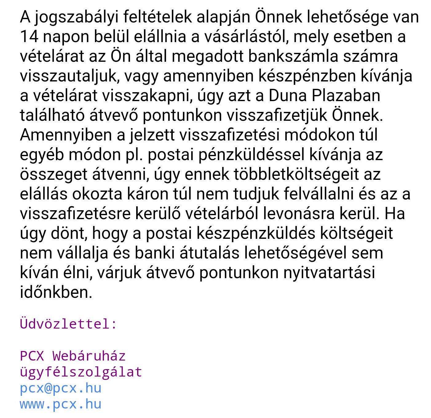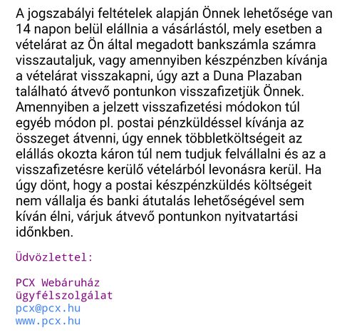 Amúgy ez a PCX (nincs velük tapasztalatom és eddig elállási joggal sem éltem sehol, így nekem ez új) e-mailt még nem kaptam tőlük, Hétfőn vették át amit Pénteken küldtem vissza.
