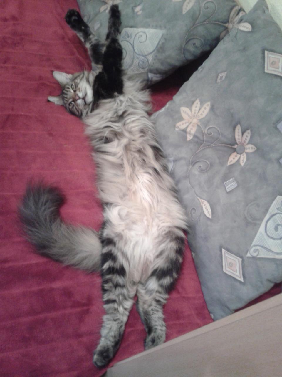 Igen, csak egy van és már nem merek másikat hozni mellé, mert fúj minden cicára amikor itt a házban találkozik másik macsekkal. Napközben dolgozok, igy egyedül van, de általában ugyanabban a pozban találom amikor hazajövök, tehát végig alszik. Néha megeteti a plüssállatát, becibálja a konyhába