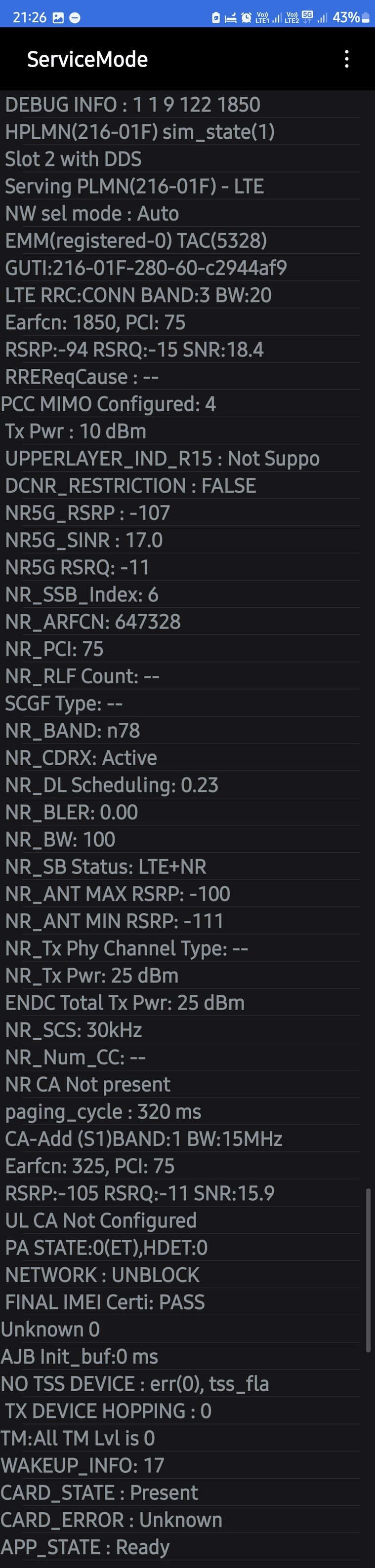 Latszik pedig hogy nalad az otthonnet SA-n van es nem fogja az 5G n78 melle a b3-at mint a teloban levo karrtya ami meg nsa-n megy. Panaszkodtak tobben is hogy amikor elkezdtek az otthonneteket sa-ra engedni hogy lassabb lett a sebesseg, foleg a feltoltesnel latvanyosabb.