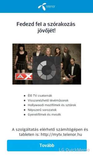 Koszi, de a lenyeg nekem ugyis az, hogy a lemaradt musorokat felvetel nelkul kesobb elinditsam (mondjuk az jo kerdes, hogy ha kozben odakapcsolok, de elejetol szeretnem, azt fogja-e egybol mutatni, vagy csak ha mar lejart). Szoval a mindigtv nem lenne jo, ahol wifihez jutok ott tv-hez is (melohelyen mondjuk meg nem fogok tevezni), de ez tetszene. Me'g az ingyenes is eleg mondjuk ha megmarad wifin ingyen, pl. a forma-1 is ott volt, meg par vetelkedo is megerne, ha olyankor nezhetnem amikor nekem kenyelmes. Egyelore meg nem regisztraltam, majd kesobb lesz csak idom kiserletezgetni...