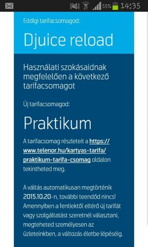 Ameddig a regi tarifacsomagod megszuntet nem tertis levelben kozlik, addig en kulonosebben nem foglalkoznek vele (leven ugye ez egy szerzodesmodositas, azt meg azert nem csak ugy a seggunkbol kirantva hajtunk vegre). Telefonoskisasszonytol is azt kernem, hogy nem jatszunk impulusvasarlosdit, a csak most, csak onnek, utolso alkalom cimu bullshitet tartsak meg, szepen kuldjek el levelben/emailben, hogy a dijcsomagom mikor fog megszunni, ahol elolvashato, hogy tenylegesen megszunik, vagy csak uj elofizetest nem engednek mar kotni ra egy adott datumtol (ebben az esetben szarod le az egeszet, mert teged ujabb huseg vallalasaig nem erint ez az egesz).
