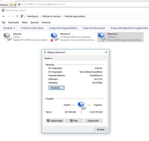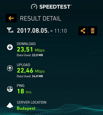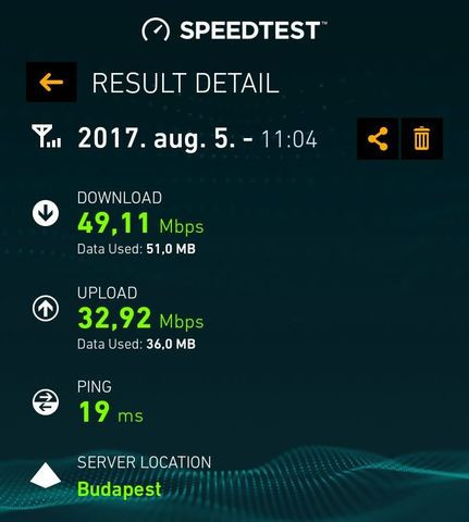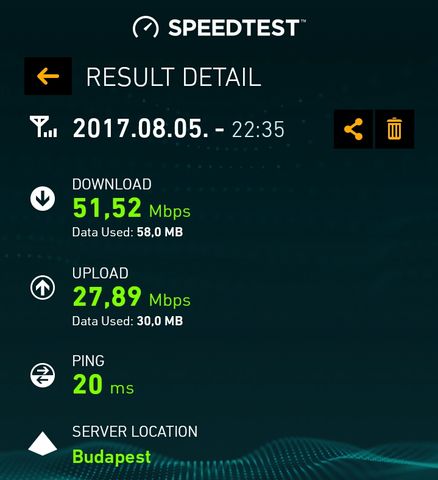 Ezt a 30-35-öt most telefonon mértem, ha tetherelem számítógépre, akkor 20/5 megabit 27-es pinggel. Ez jóval alatta van az eddig mért értékeknek. Valamivel lassabb, a tényleges felhasználást tekintve is, de teljesen használható böngészésre, youtube-ra stb. mint korábban.