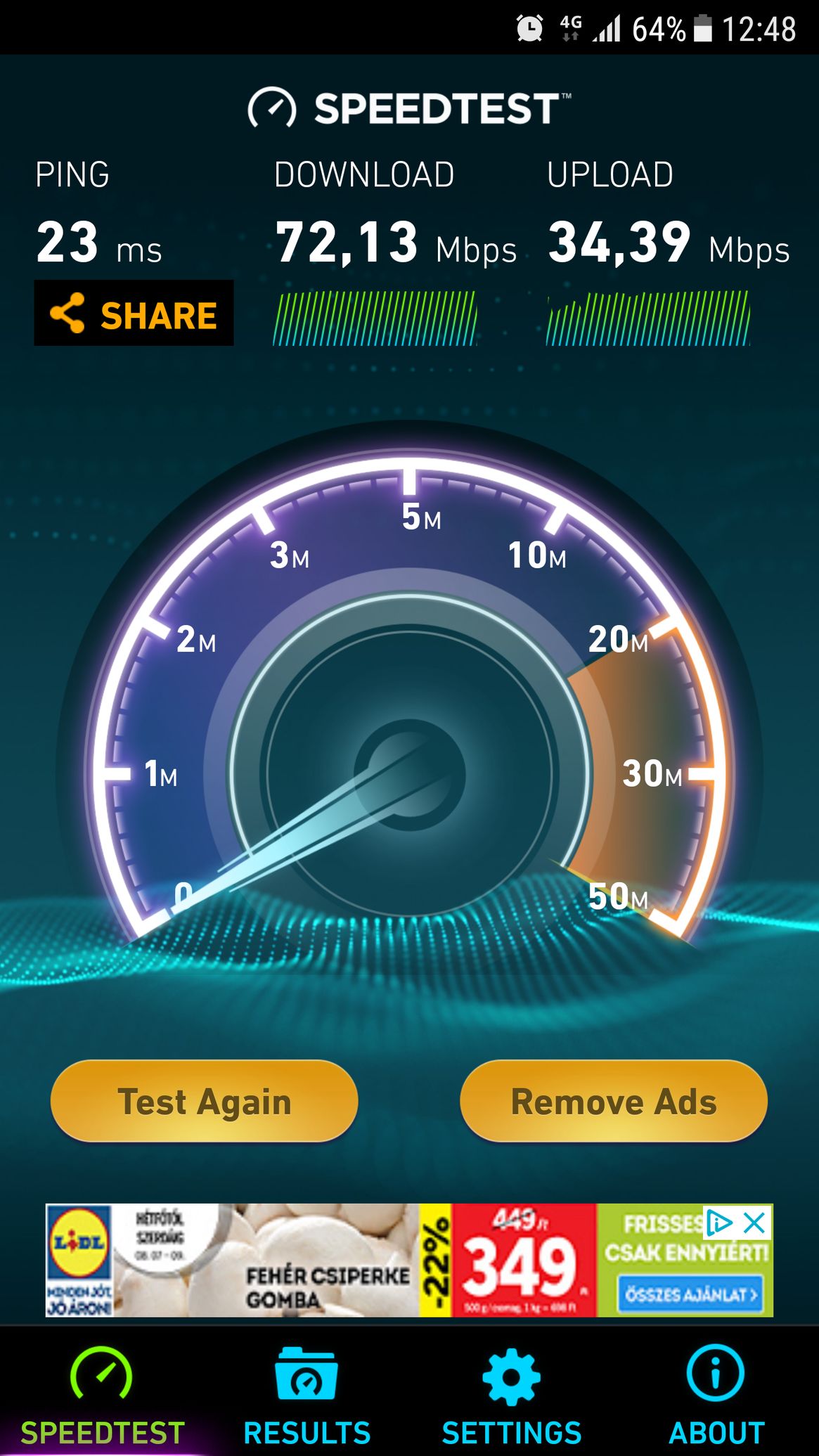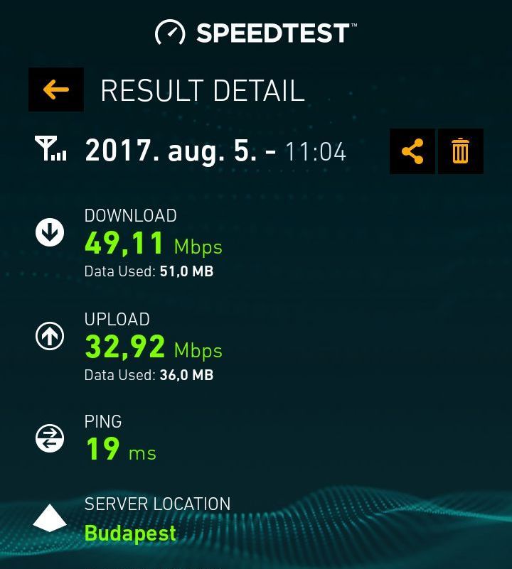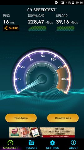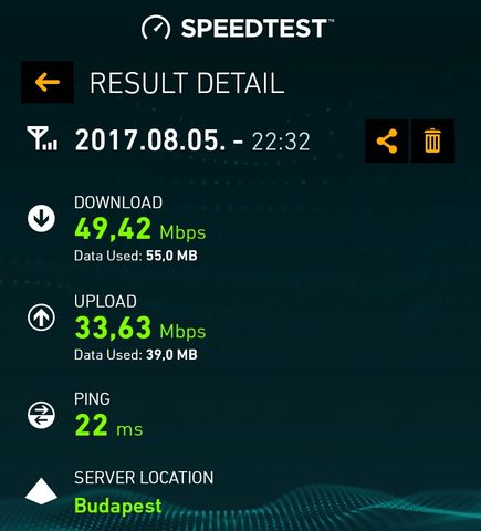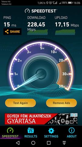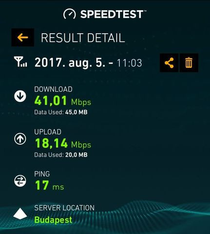 Én is méregetek a hello datával, hogy hogy alakul a sebesség, itt nálam olyan 30-35 megabit. Ettől itthon számottevően nem szokott jobb lenni nap közben, tehát olyan 45-50-re felmegy de többre nem, néha láttam 60-at.
