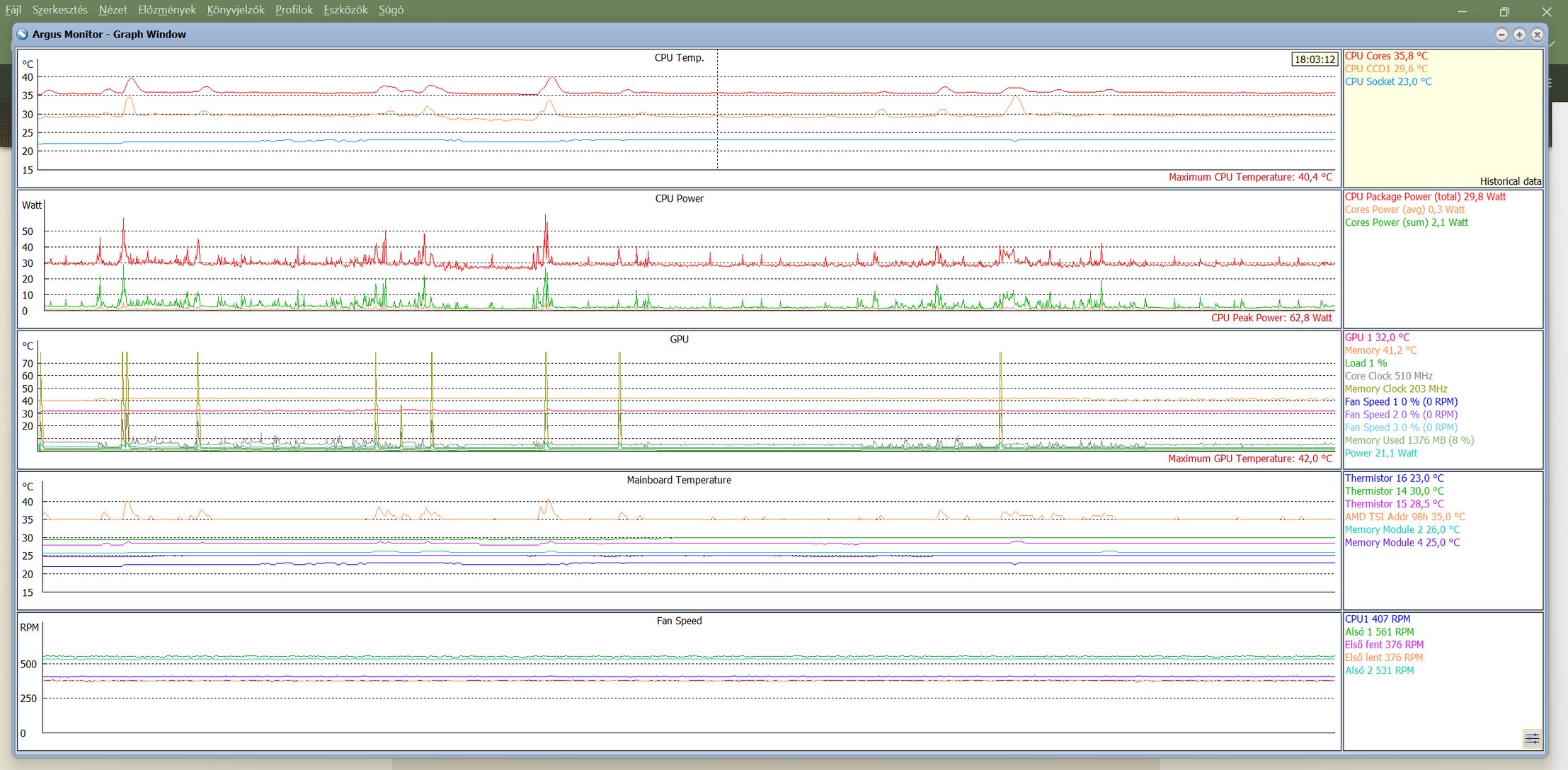 Ez alól kivétel a proci középső ventije, az 40%-on pörög és 65 fok fölött 50%-ra gyorsul.