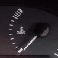 Menet közben a hőmérő óra mutatója, nagyjából, vízszintesen áll, talán egy kicsit lejjebb, a lényeg, hogy a skála közepére mutat.
