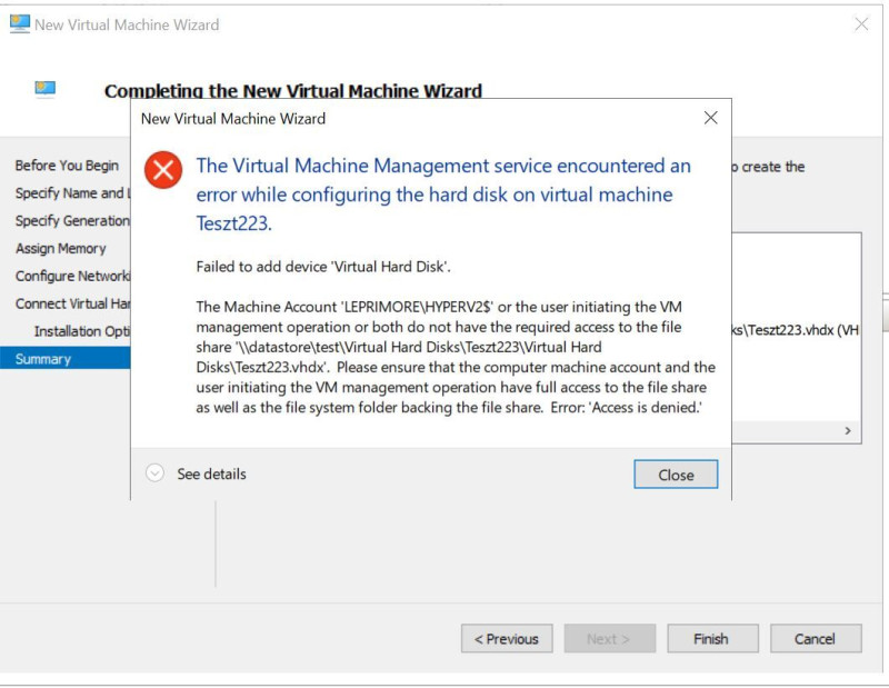 Ezt kapom, jogok rendben, ha hyperv1 próbálom szintén. De időnként gondol egyet és létretudok hozni vm-et, cli-ből pedig mindig gond nélkül létre tudom hozni a disk-et.