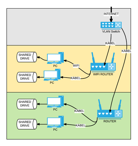 (Altalanos ertelemben az interneteleresnel a szolgaltato egy darab IPv4 cimet biztosit szamodra.)Ha az "internet" -re csatlakozva privat IP cimet kapsz (10.0.0.0/8, 172.16.0.0/12, 192.168.0.0/16) es akar tobb gepen is egyszerre, akor nincs szukseg a VLAN-ozasra, csak a 2 router (wifi router es router) "internet"-tol eltero alhalozati beallitasat kell elvegezni a LAN oldalon.