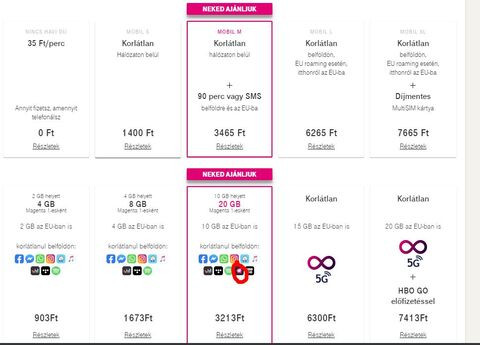 Facebook, Instagram, Waze, Messenger, WhatsApp, Spotify, Tidal, Apple music, Deezer.10GB-os csomag esetén még ezekhez jön HBO GO, TV GO vagy Telekom TV GO.