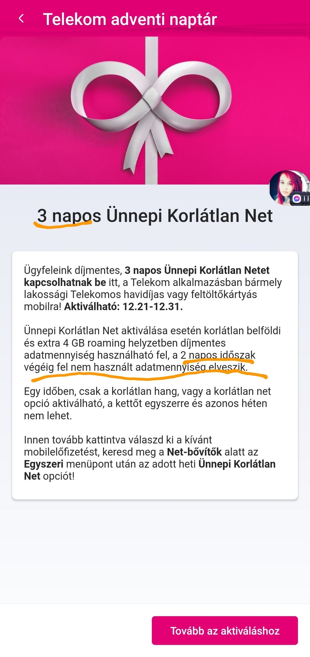 Volt promóciós cikk, ott le volt írva, hogy decemberben minden héten két nap kapcsolható korlátlan hívás vagy net, és a karácsonyi héten pedig három nap lesz korlátlan... Természetesen az is úgy, hogy vagy ez vagy az, bekapcsolástól három nap egybefüggően, tehát a napok nem oszthatók szét.