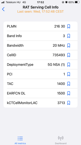 A gyakorlatban így az ikon csak annyit jelent, hogy az elmúlt fél percben voltál olyan toronyhoz csatlakozva, ami tud 5G-t.De a Netmonster se szentírás, ha megnézed 1800+2100+700+800-at ír, pedig Telekomos kártyával biztosan nincs 800 MHz CA-ban a Dunántúlon. Alatta a BW-nél már jól írja, hogy 3 sáv van csak valójában használatban.