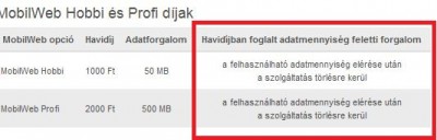 MobilWeb Hobbi 1000 Ft 50 MB a felhasználható adatmennyiség elérése után