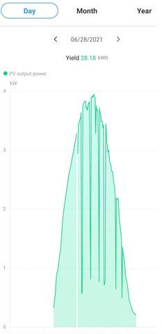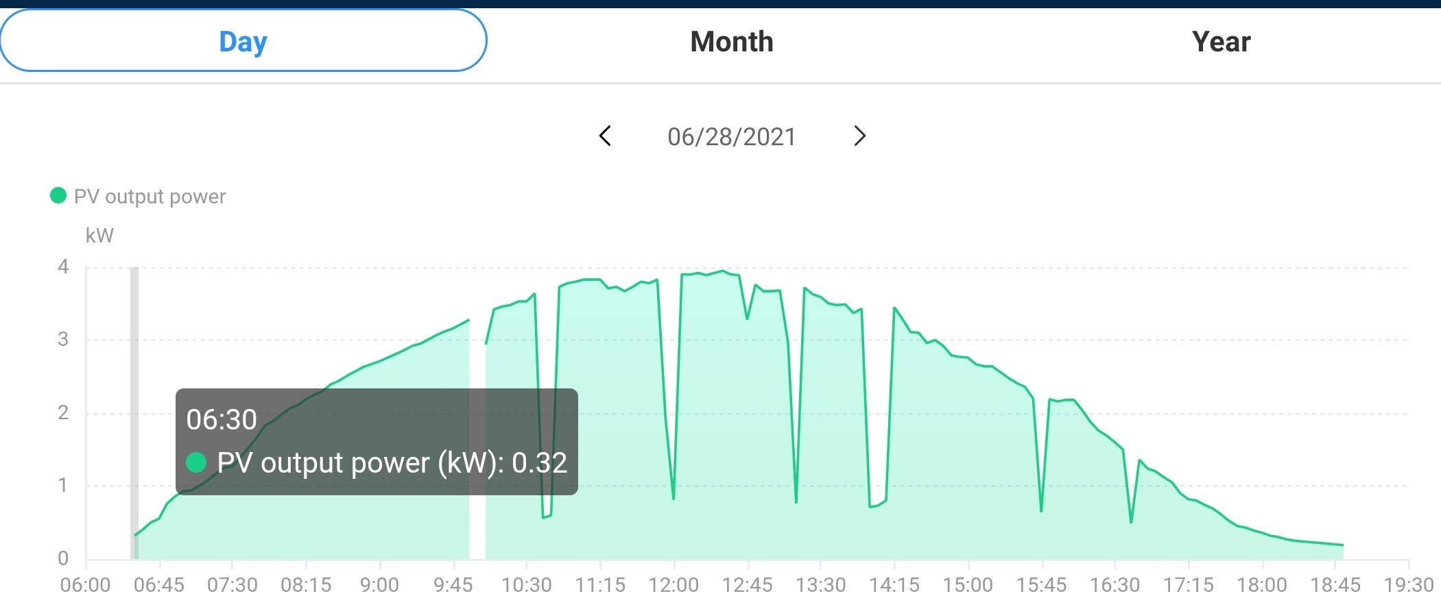 A 10 óra körüli kiesés valószínűleg a magas AC feszültségnek köszönhető. 252V feszültségnél letilt az inverter, majd a feszültség csökkenése után visszakapcsol. Nekem is volt több ilyen beszakadásom a közelmúltban.