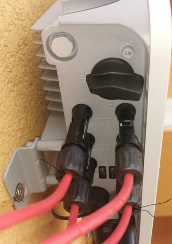 Utána DC kapcsoló: ON, aztán reggel már hamarabb indulnia kellene a termelésnek.(Ha ez tartós megoldás lesz, érdemes majd lezárni ezeket (az inverteren üresen maradt aljzatokat), hogy ne költözzön bele rovar. És hogy szép is legyen, a PV2- vezetéket átdugni a PV1- -ba.)