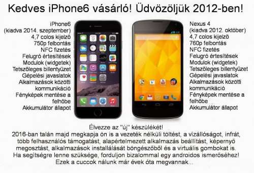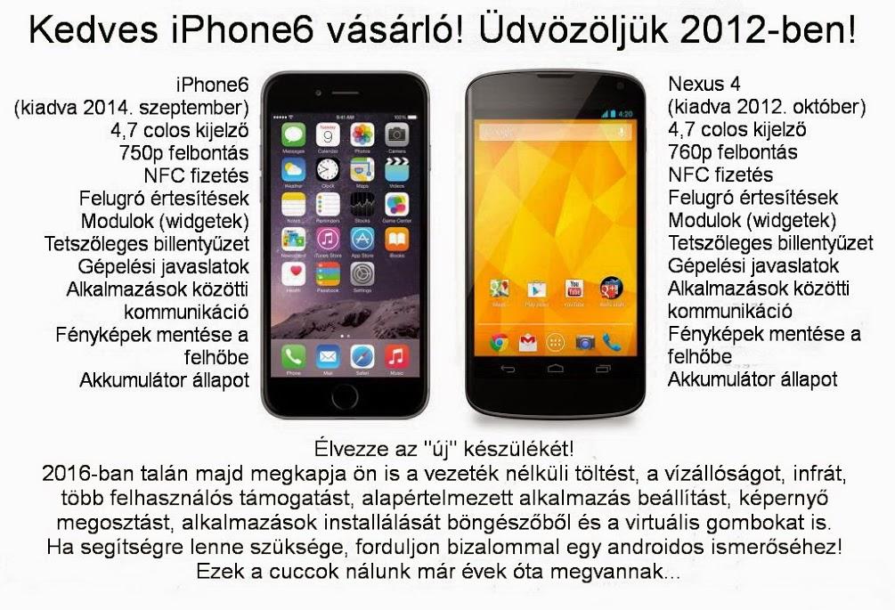 ). Egy masik esetben szinten iphone 4 vagy 4 s-nel az egyik gyerek akart gyorsan egy fenykepet csinalni a munkahelyemen es ott meg a kamera app nem reagalt, kb 2 percig probalkozott, aztan inkabb bementem a n5-ert amit a masik helyisegben hagytam, hogy csinaljak egy kepet. Az iphone addigra sem tert magahoz, a srac nem tudta megmagyarazni "szokott hulyeskedni de ilyeneket nem szokott csinalni" volt a reakcio. De hozza kell tenni, hogy ezeken ugye az uj szoftverek futnak amiktol hasznalhatatlanul lassu a cucc (ez ugye meg onmagaban egy vicc, de ez egy ujabb tema lenne).Visszaterve: bennem (valoszinuleg a regi iphone 3g-m emleke miatt, ami annak idejen gyorsnak tunt az androidos akadozo konkurencia mellett) tovabbra is az a (tev)hit el, hogy az iphone-ok a legjobban optimalizaltak es a leginkabb gyorsabbak, szep animaciokkal, stb.