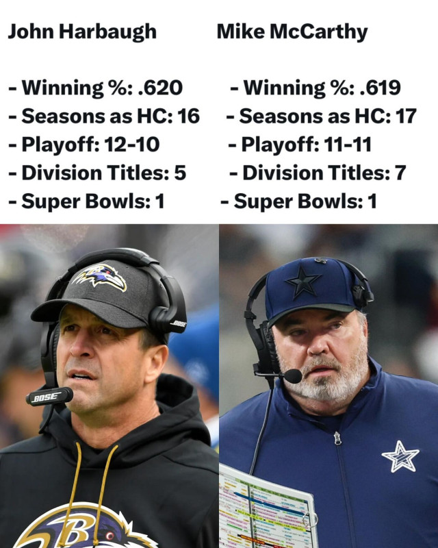 Tudom, hogy pusztán a számok nem jelentenek sokat, de akkor is vicces, hogy Harbaugh az edző isten, akit most mindenki akar, McCarthy meg az a fószer, akivel nem lehet eredményes csapatot építeni...