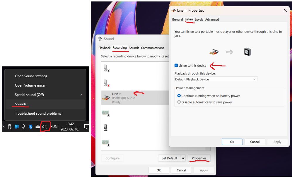 Switch dock ---[hdmi kábel]---> monitor ---[male-male jack kábel]---> PC audio line inWindowson pedig a Line-In-nél bekapcsoltam a "Listen to this device" opciót. Amikor játszani akarok, akkor az egyik monitoromat átkapcsolom a switchre, ezután pedig egyszerre szól a fülesemben a PC és a Switch is.