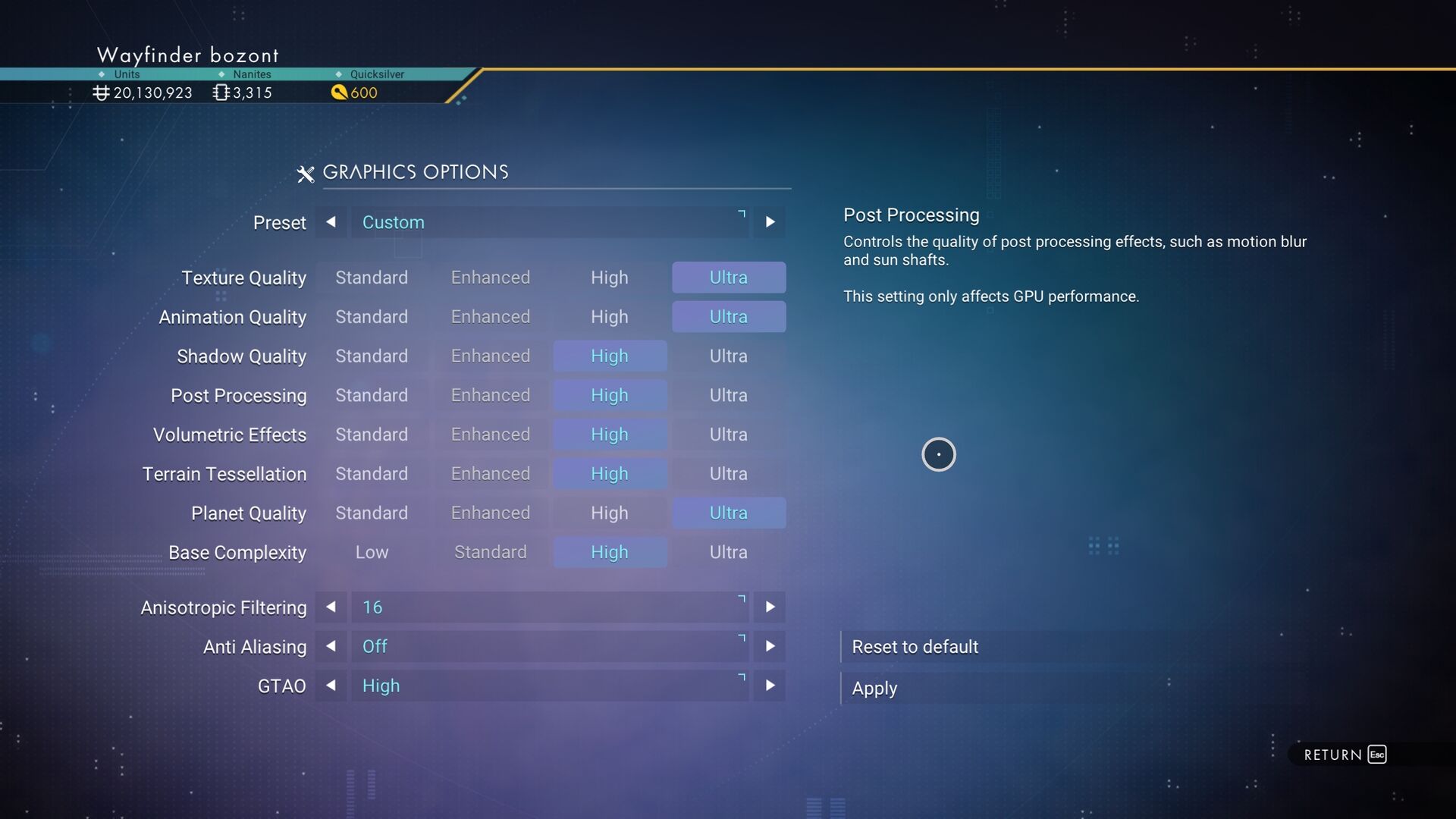 No Man's Sky\Binaries\SETTINGS\TKGRAPHICSSETTINGS.MXMLEzt a két sort keresd benne és mindegy milyen értékek szerepelnek a végén, mindkettőt írd át nullára, így nézzen ki: