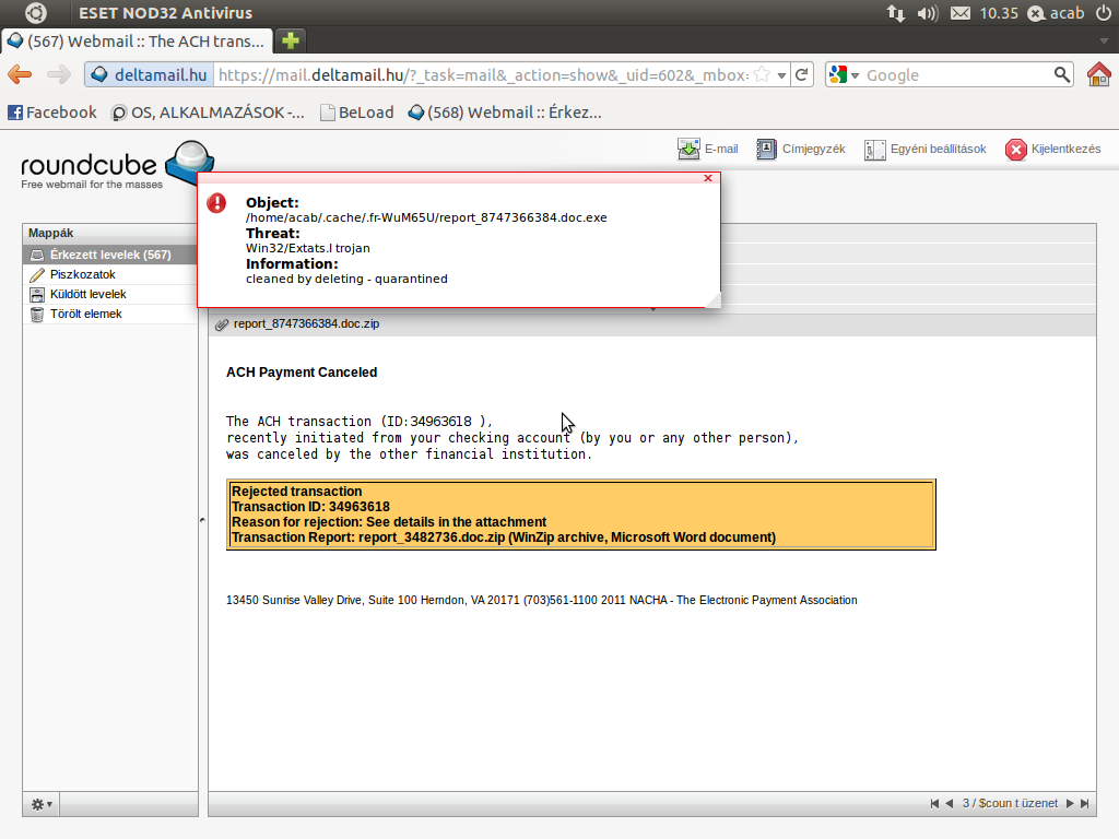 ESET NOD32 Antivirus for Linux Desktop felriasztott egy csatolmányra bár itt mindig valami fertőzött állományt küldenek ,de jó látni ,hogy dolgozik a háttérben.