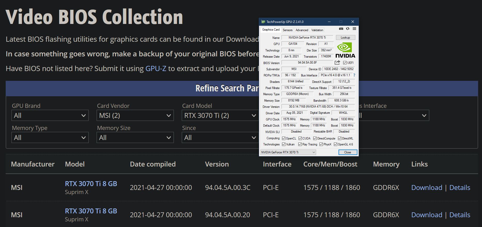 Megpróbáltam feltölteni a techpowerup adatbázisába a kártyám BIOS-át, de azt írja hogy már ilyen van nekik, viszont 2db 3070 Ti Suprim X-et listáz és a BIOS verziók nem igazán ugyan azok ha a számokat nézem: