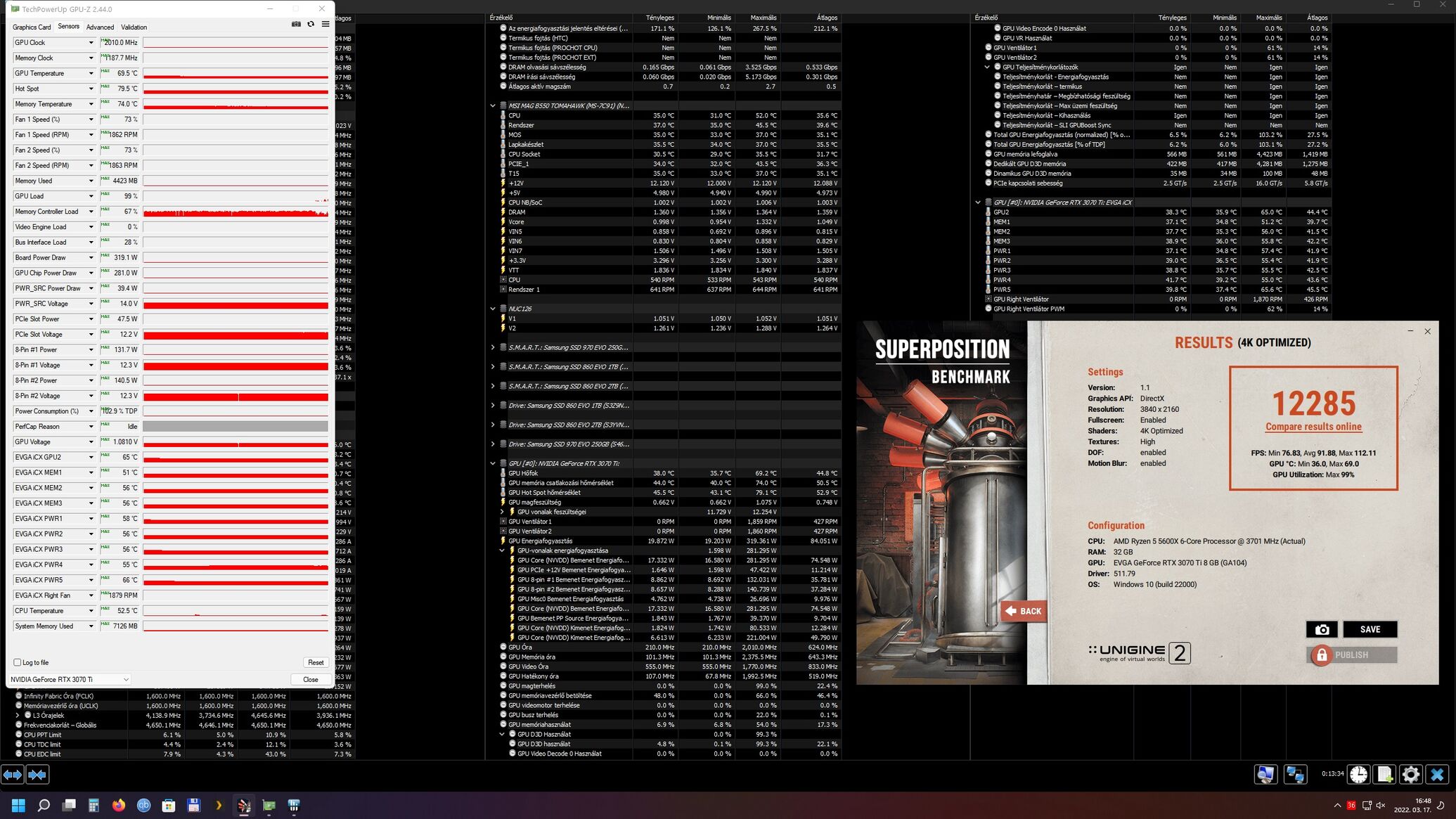 Az enyém egy Gigabyte Aorus Master. Azt nézegettem, hogy az órajele fix 1995Mhz terhelés alatt. Ezt gyári beállításokkal hozza, nem nyúltam semmihez eddig. Így volt 66 fokos a GPU, szerintem ez is jó. A memória 70 fokos volt, ezt nem tudom mennyire számít jónak, vagy elfogadhatónak. -