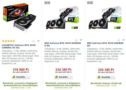 Nem is értem ezt a nagy parázást. Folyamatosan kezdetek óta lehet kapni, raktárról vagy 2-3 napos rendelésre 280-290-300 ezerért 3070-eseket. 300-ért már tényleg nagyon jó hűtéssel, top közeli verziókat. Több helyről.