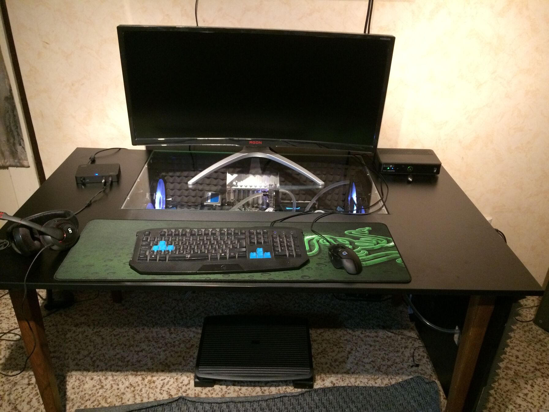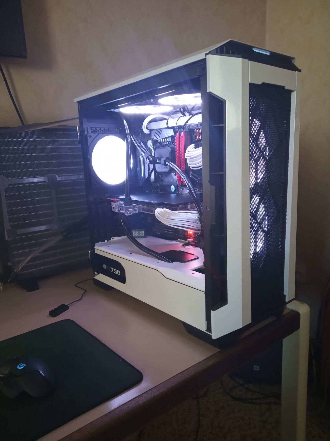 Gep az asztal alatt. A klima nem itt van, hanem abban a szobaban, ahol a 2db kulso radi van. Ebben a szobaban most melegebb van, olyan 25-26 fok, lasd az front intake -nel mert homersekletet.