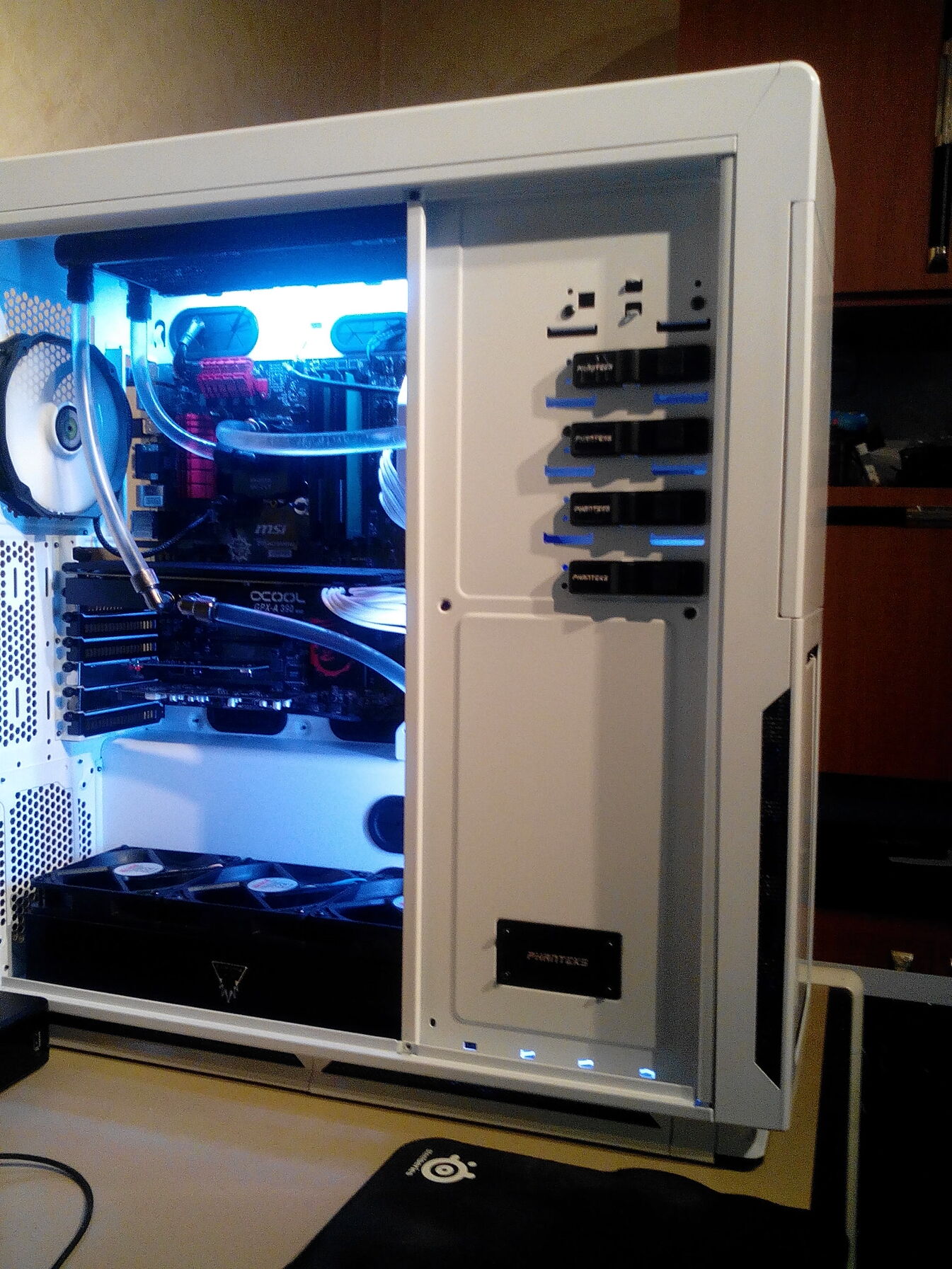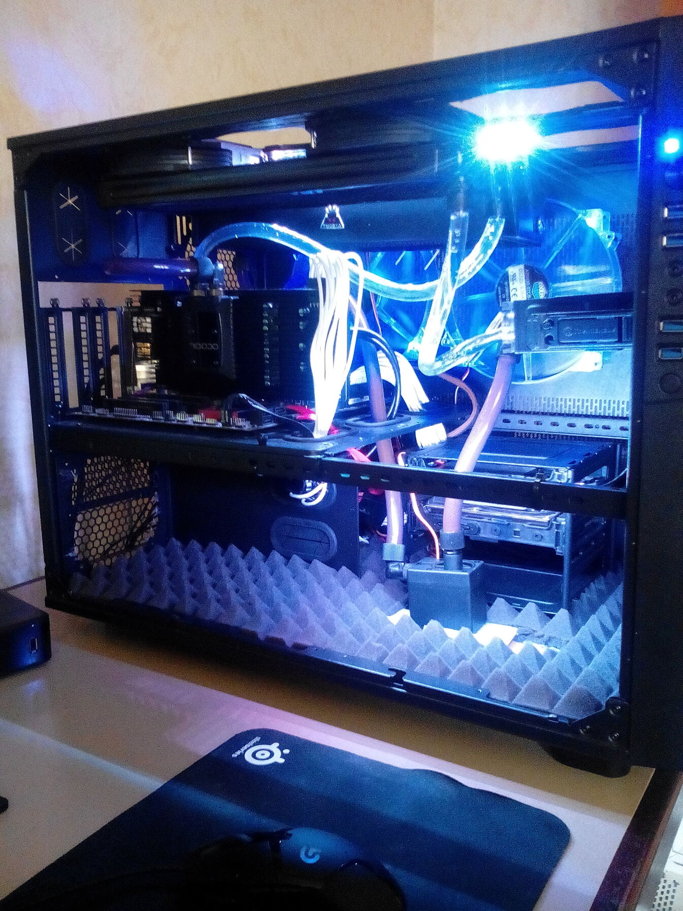 A gep kulon szobaban van, ami nyitott. Kenytelen voltam igy csinalni, mert jatek kozben 1 ora alatt 5 fokot emelt a kis szoba belso hofokan, amikor itt volt bent probabol.Es hidd el, az elozo hazammal sokkal rosszabb volt a kisebb hely. Itt a haz es a ket radi nincs akkora, mint a Tower 900 volt onmagaban.