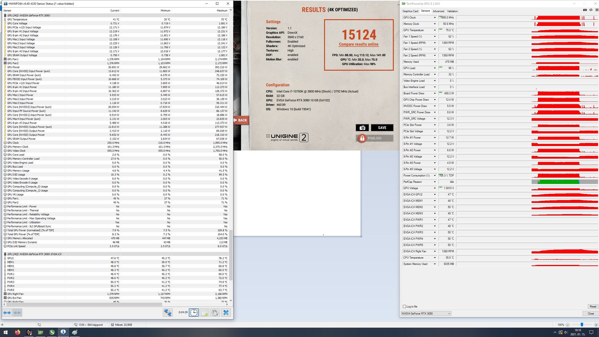 3080 FTW3 és 3080Ti hűtője ugyanaz, sajnos nem kapta meg 3090 hűtőjét a 3080Ti. Ezekben a hőfokokban már van egy újra padozás és újra pasztázás, és most már egy Lian Li Lancool III, így már tényleg frankó! Jah, és UV (0,925V, 1965Mhz), viszonylag agresszív venti görbével.